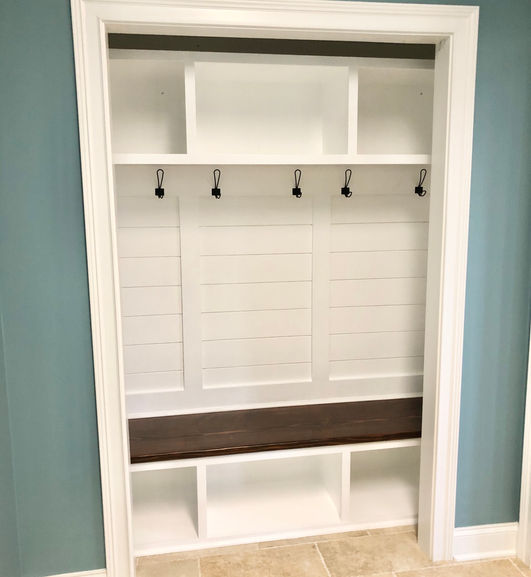 Converting a closet into a locker system sounds simple... but when the opening is narrower than the interior of the closet, things don't just pop into place! This beautiful closet conversion took our client's simple closet and transformed it into a farmhouse style locker system!